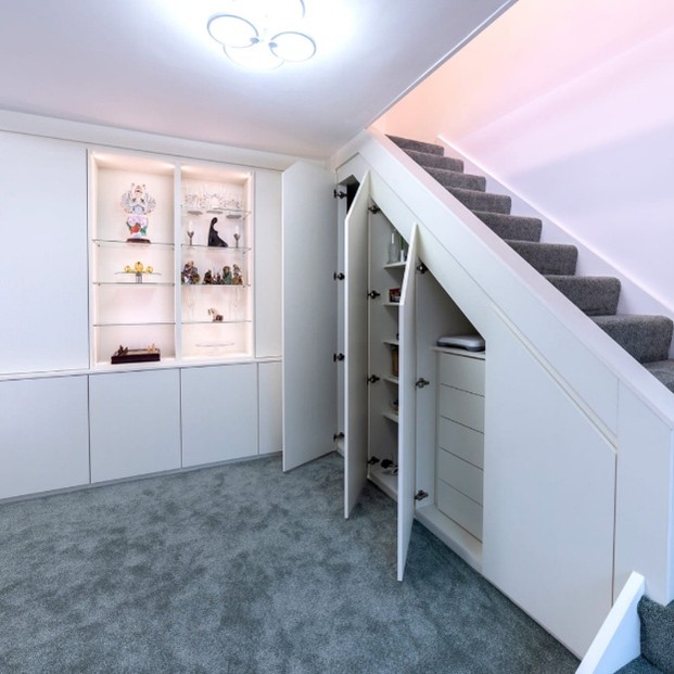 All understairs furniture is custom designed to fit the available space precisely, ensuring a polished and integrated finish that blends effortlessly with the rest of your living room.